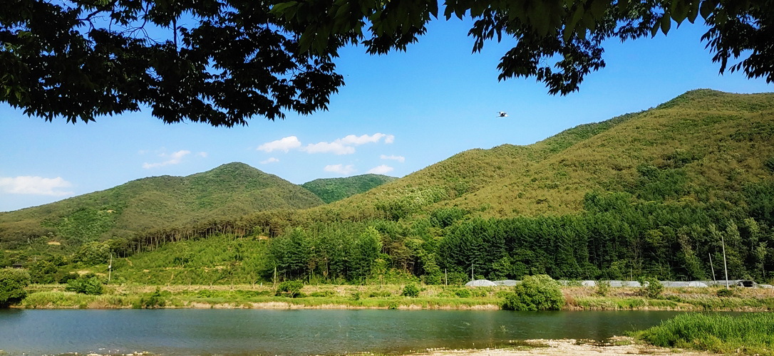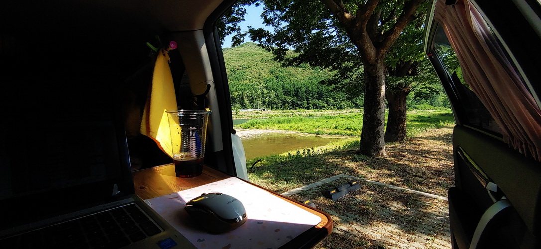 시원한 강가에 차를 세워고 양문을 여니